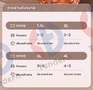 | ขนาด | 1.5 ลิตร, 1.5ลิตร แบบมีหม้อนึ่ง, 2ลิตร, 2ลิตรแบบมีหม้อนึ่ง, 3ลิตร, 3ลิตร แบบมีหม้อนึ่ง, 4ลิตร, 4ลิตร แบบมีหม้อนึ่ง |